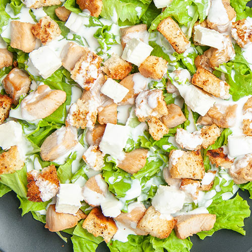 Chicken available grilled or fried. Dressings: Ranch, Bleu Cheese, Caesar, Balsamic Vinaigrette, Honey Mustard, Oil & Vinegar, Balsamic Glaze.